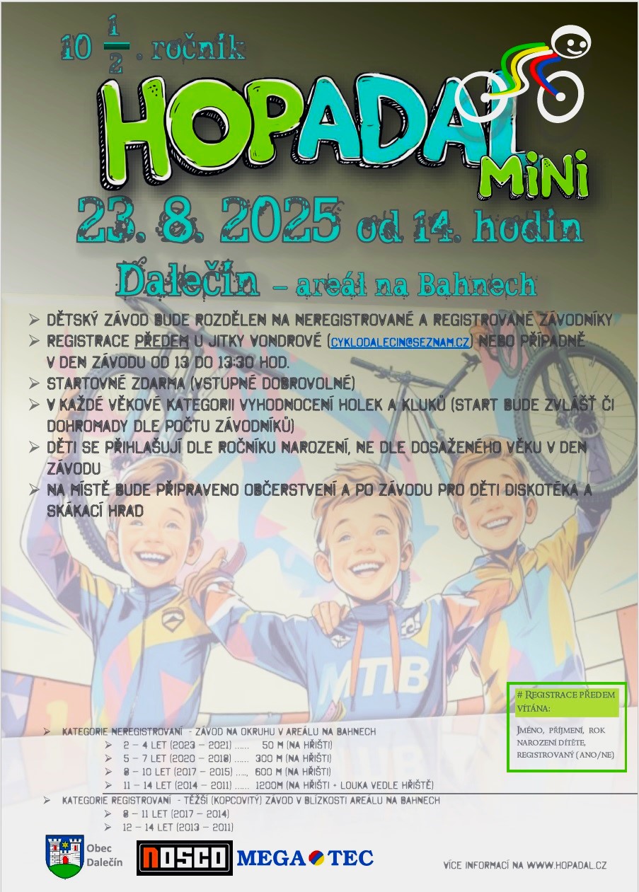 3. HoPáDal mini - Srdečně zveme všechny dětské amatérské cyklisty i závoďáky na závody HoPáDal do Dalečína. Prosíme všechny o registraci předem na cyklodalecin@seznam.cz, protože dle počtu účastníků mohou být ještě upraveny kategorie (v případě zájmu ještě zahrneme do kategorií závoďáků i 15 leté, také se hlaste). Proběhne vyhlášení prvních 3 nejlepších v každé kategorii (těšit se můžete na bohaté ceny). A pozor. Závod je rozdělen na amatéry a na závoďáky (tzv. registrované), kteří jezdí po závodech, jsou v cyklistických klubech a podobně. Tito závoďáci budou mít těžší trať, která bude i v terénu okolí Dalečína. Amatérští jezdci budou jezdit pouze v areálu na Bahnech. Pro více info sledujte www.hopadal.cz.